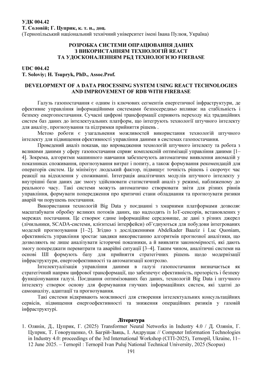 | Bibliographic citation (APA): | Soloviy, T., & Tsupryk, H. (2025). Rozrobka systemy opratsiuvannia danykh z vykorystanniam tekhnolohii react ta udoskonalenniam rbd tekhnolohiieiu firebase [Development of a data processing system using react technologies and improvement of rdb with firebase]. Materials of the ⅩⅢ Scientific and Technical Conference “Information Models, Systems, and Technologies”, 17-18 December 2025, Ternopil, 191-192. TNTU. [in Ukrainian]. |