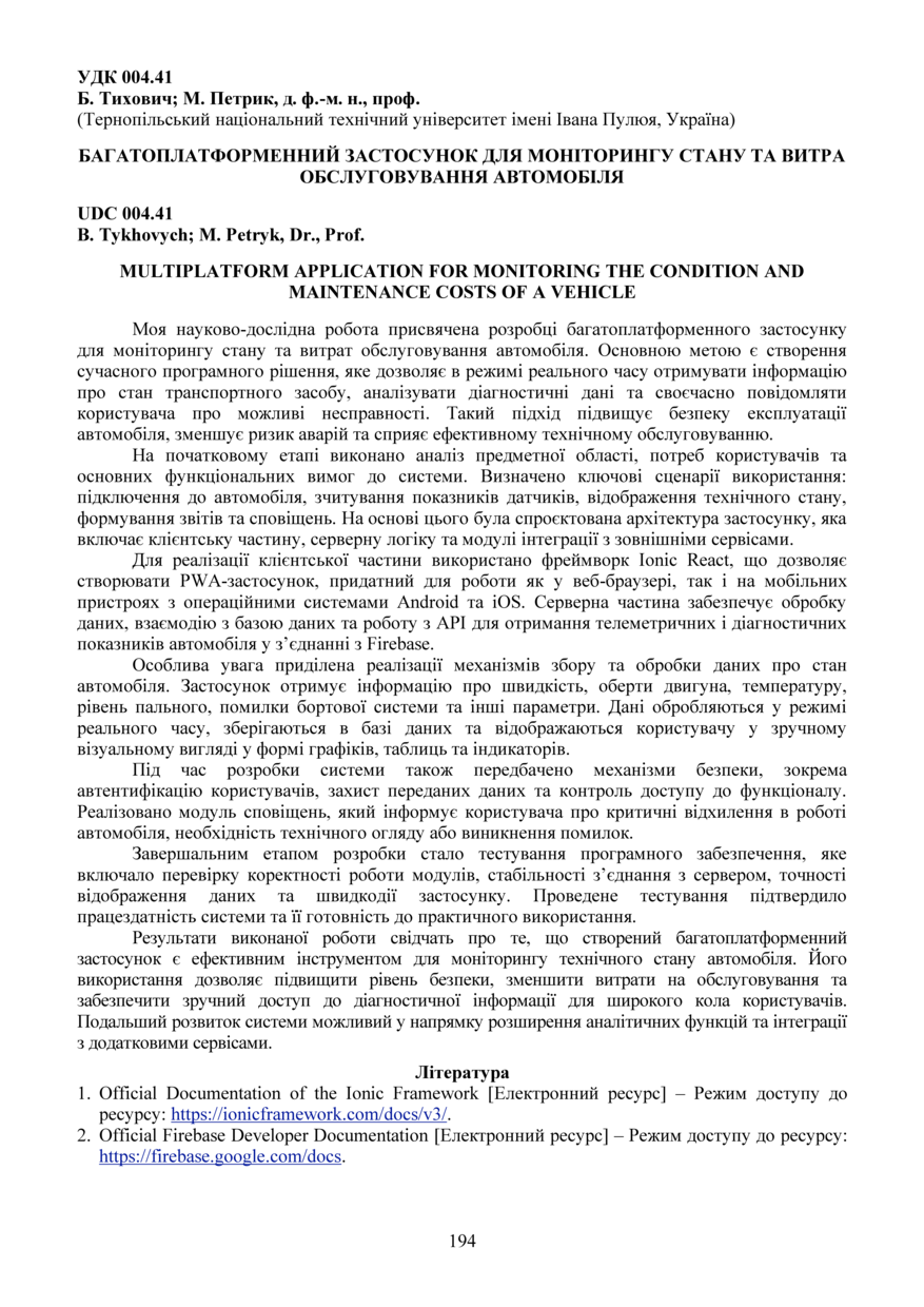 | Bibliographic reference (2015): | Тихович Б., Петрик М. Багатоплатформенний застосунок для моніторингу стану та витра обслуговування автомобіля // Матеріали ⅩⅢ науково-технічної конференції „Інформаційні моделі, системи та технології“, Тернопіль, 17-18 грудня 2025 року. 2025. С. 194. |