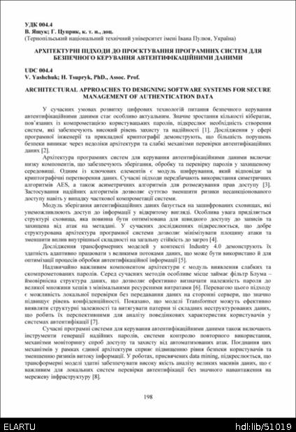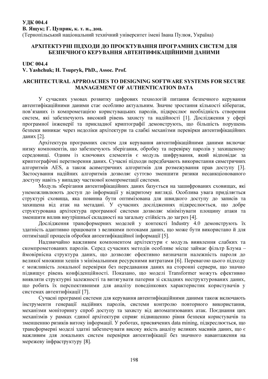 Bibliographic citation (APA): Yashchuk, V., & Tsupryk, H. (2025). Arkhitekturni pidkhody do proiektuvannia prohramnykh system dlia bezpechnoho keruvannia avtentyfikatsiinymy danymy [Architectural approaches to designing software systems for secure management of authentication data]. Materials of the ⅩⅢ Scientific and Technical Conference “Information Models, Systems, and Technologies”, 17-18 December 2025, Ternopil, 198-199. TNTU. [in Ukrainian].