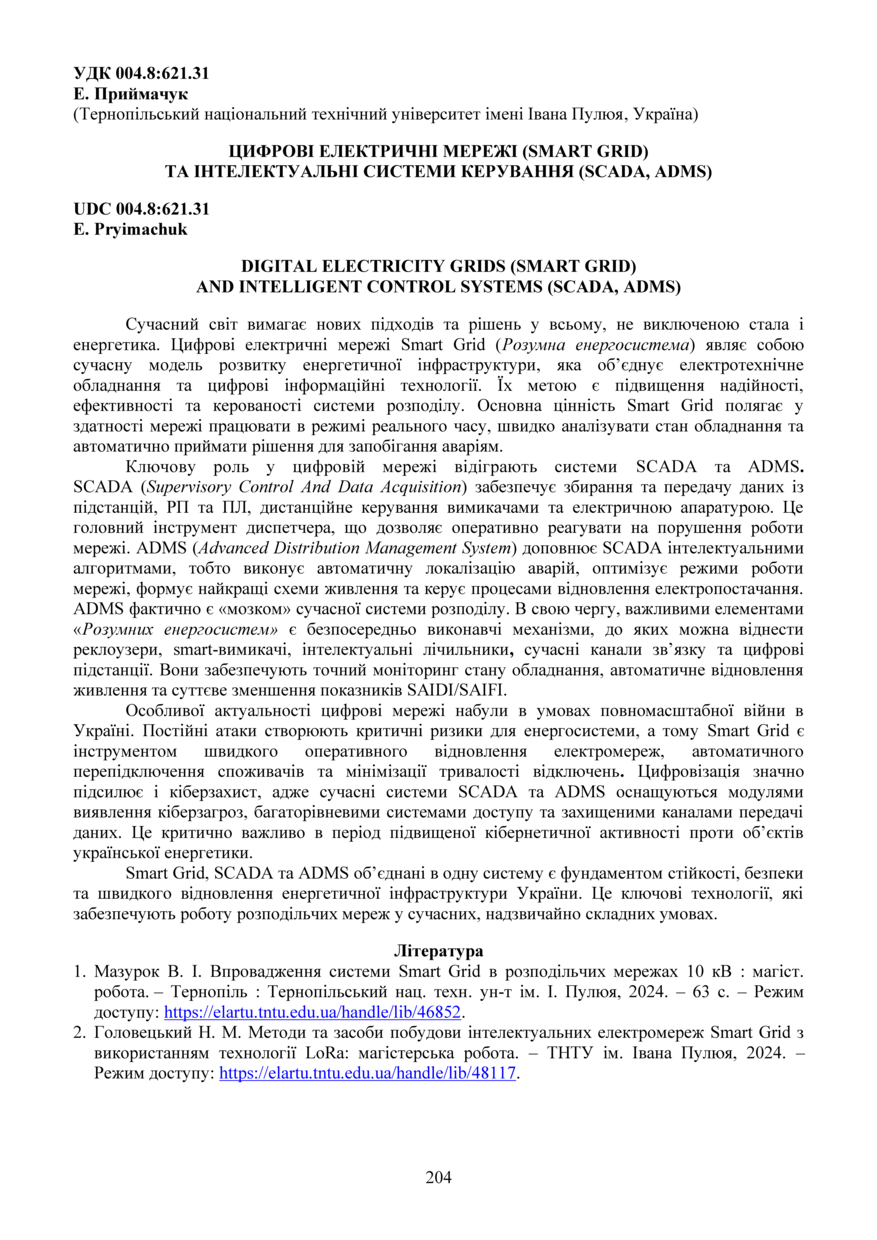 Bibliographic citation (APA): Pryimachuk, E. (2025). Tsyfrovi elektrychni merezhi (smart grid) ta intelektualni systemy keruvannia (scada, adms) [Digital electricity grids (smart grid) and intelligent control systems (scada, adms)]. Materials of the ⅩⅢ Scientific and Technical Conference “Information Models, Systems, and Technologies”, 17-18 December 2025, Ternopil, 204. TNTU. [in Ukrainian].