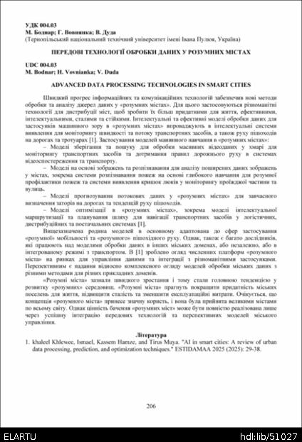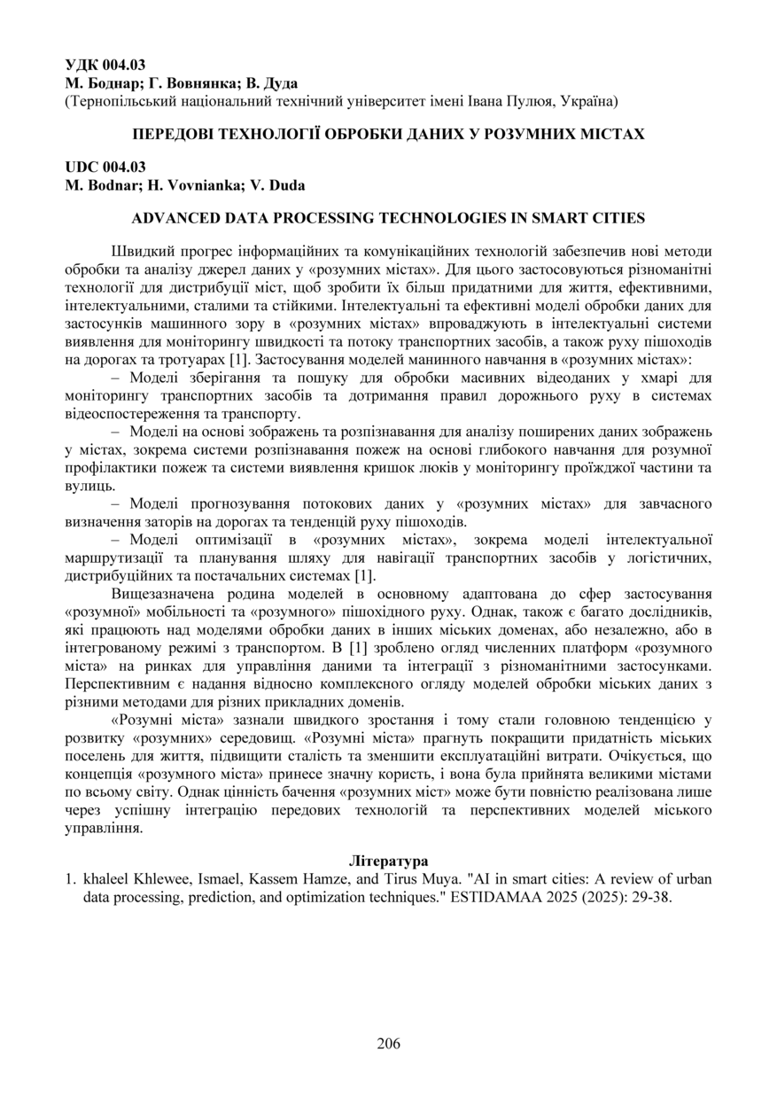 | Bibliographic citation (APA): | Bodnar, M., Vovnianka, H., & Duda, V. (2025). Peredovi tekhnolohii obrobky danykh u rozumnykh mistakh [Advanced data processing technologies in smart cities]. Materials of the ⅩⅢ Scientific and Technical Conference “Information Models, Systems, and Technologies”, 17-18 December 2025, Ternopil, 206. TNTU. [in Ukrainian]. |