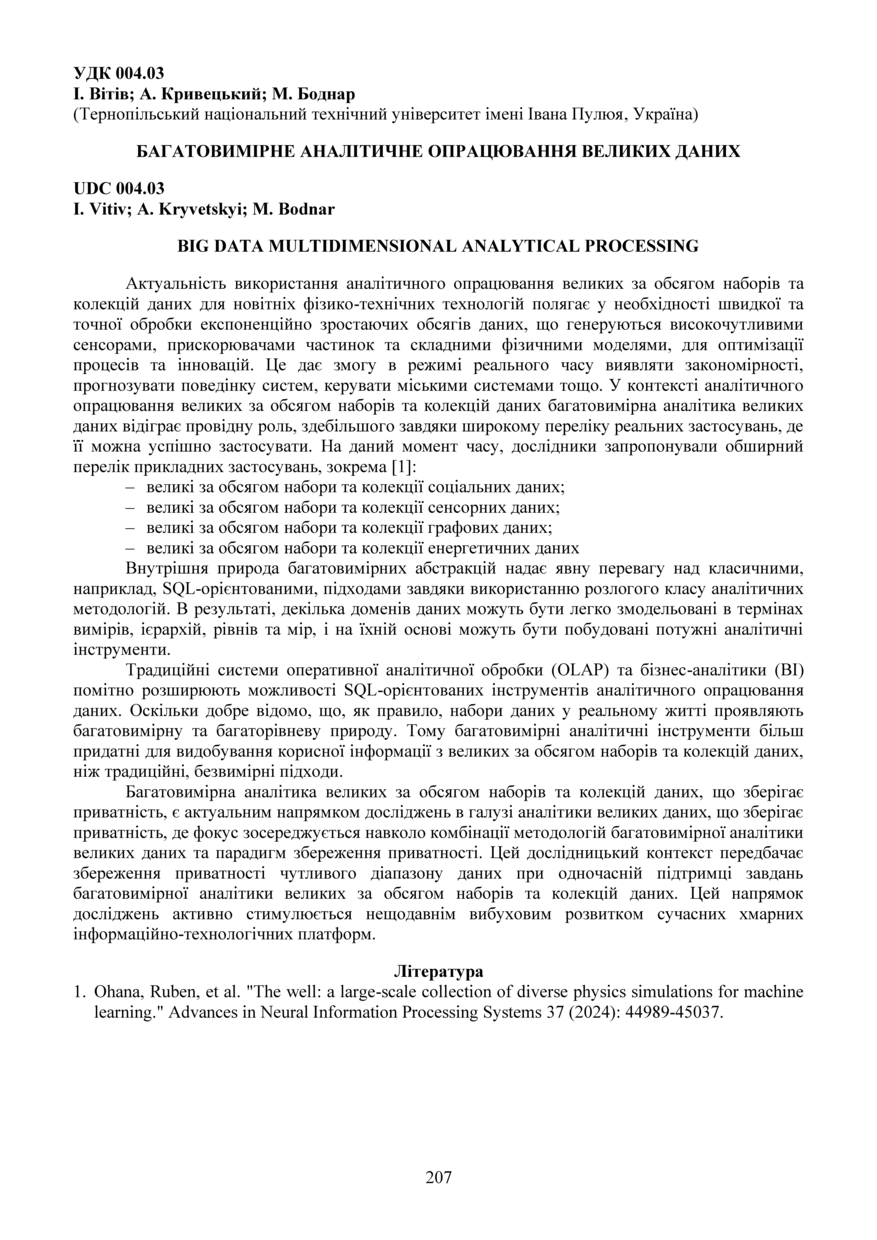 Bibliographic citation (APA): Vitiv, I., Kryvetskyi, A., & Bodnar, M. (2025). Bahatovymirne analitychne opratsiuvannia velykykh danykh [Big data multidimensional analytical processing]. Materials of the ⅩⅢ Scientific and Technical Conference “Information Models, Systems, and Technologies”, 17-18 December 2025, Ternopil, 207. TNTU. [in Ukrainian].