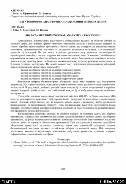 Bibliographic citation (CHICAGO): Vitiv I., Kryvetskyi A., Bodnar M. (2025) Bahatovymirne analitychne opratsiuvannia velykykh danykh [Big data multidimensional analytical processing]. Materials of the ⅩⅢ Scientific and Technical Conference “Information Models, Systems, and Technologies” (Tern., 17-18 December 2025), pp. 207 [in Ukrainian].