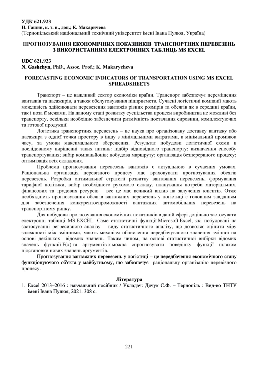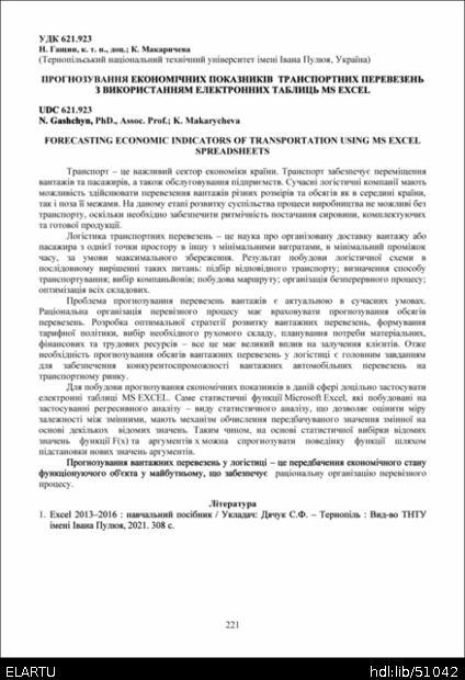 | Bibliographic citation (APA): | Gashchyn, N., & Makarycheva, K. (2025). Prohnozuvannia ekonomichnykh pokaznykiv transportnykh perevezen z vykorystanniam elektronnykh tablyts ms excel [Forecasting economic indicators of transportation using ms excel spreadsheets]. Materials of the ⅩⅢ Scientific and Technical Conference “Information Models, Systems, and Technologies”, 17-18 December 2025, Ternopil, 221. TNTU. [in Ukrainian]. |