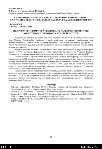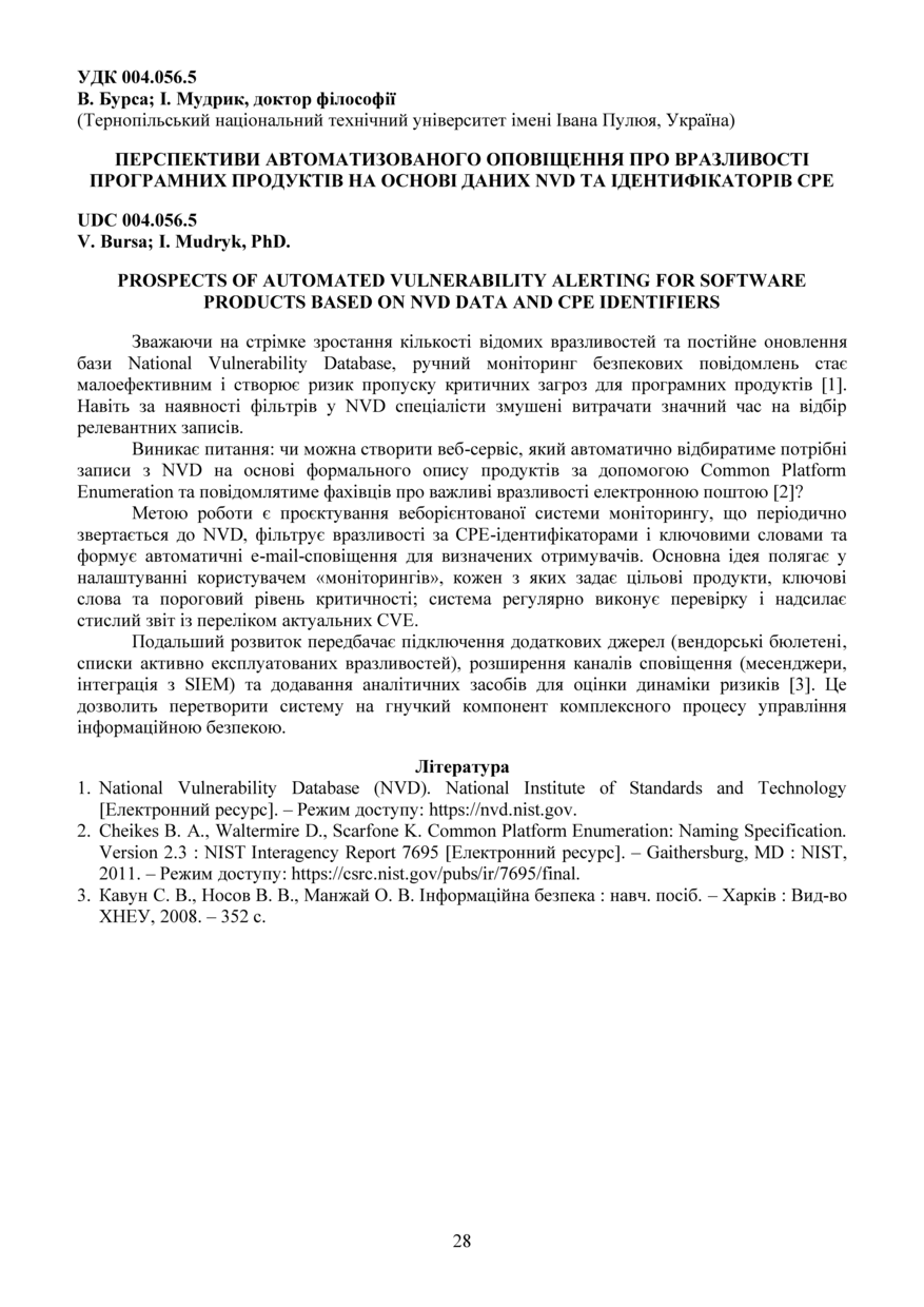 | Bibliographic citation (APA): | Bursa, V., & Mudryk, I. (2025). Perspektyvy avtomatyzovanoho opovishchennia pro vrazlyvosti prohramnykh produktiv na osnovi danykh NVD ta identyfikatoriv CPE [Prospects of automated vulnerability alerting for software products based on NVD data and CPE identifiers]. Materials of the ⅩⅢ Scientific and Technical Conference “Information Models, Systems, and Technologies”, 17-18 December 2025, Ternopil, 28. TNTU. [in Ukrainian]. |