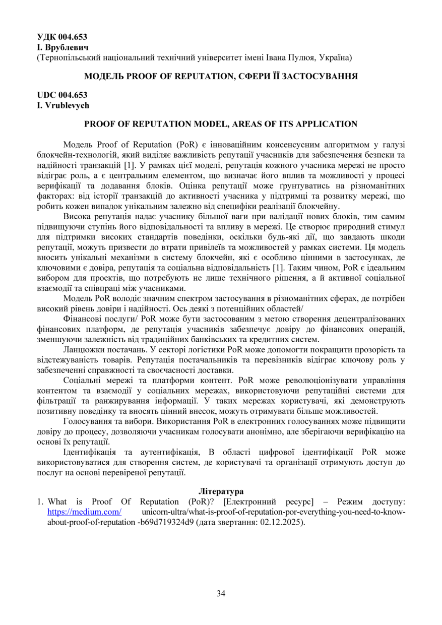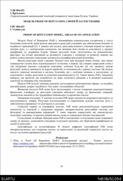 | Bibliographic citation (APA): | Vrublevych, I. (2025). Model proof of reputation, sfery yii zastosuvannia [Proof of reputation model, areas of its application]. Materials of the ⅩⅢ Scientific and Technical Conference “Information Models, Systems, and Technologies”, 17-18 December 2025, Ternopil, 34. TNTU. [in Ukrainian]. |