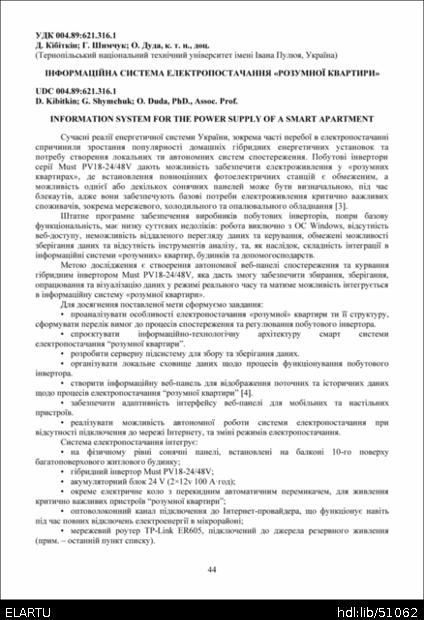 | Bibliographic citation (APA): | Kibitkin, D., Shymchuk, G., & Duda, O. (2025). Informatsiina systema elektropostachannia "rozumnoi kvartyry" [Information system for the power supply of a smart apartment]. Materials of the ⅩⅢ Scientific and Technical Conference “Information Models, Systems, and Technologies”, 17-18 December 2025, Ternopil, 44-45. TNTU. [in Ukrainian]. |