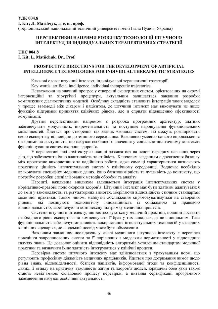 Bibliographic citation (APA): Kit, I., & Matiichuk, L. (2025). Perspektyvni napriamy rozvytku tekhnolohii shtuchnoho intelektu dlia indyvidualnykh terapevtychnykh stratehii [Prospective directions for the development of artificial intelligence technologies for individual therapeutic strategies]. Materials of the ⅩⅢ Scientific and Technical Conference “Information Models, Systems, and Technologies”, 17-18 December 2025, Ternopil, 46-47. TNTU. [in Ukrainian].