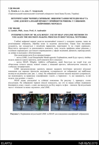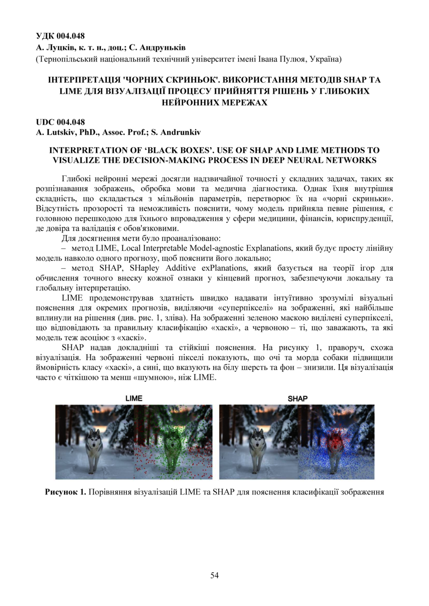 | Bibliographic citation (APA): | Lutskiv, A., & Andrunkiv, S. (2025). Interpretatsiia 'chornykh skrynok'. vykorystannia metodiv shap ta lime dlia vizualizatsii protsesu pryiniattia rishen u hlybokykh neironnykh merezhakh [Interpretation of ‘black boxes’. use of shap and lime methods to visualize the decision-making process in deep neural networks]. Materials of the ⅩⅢ Scientific and Technical Conference “Information Models, Systems, and Technologies”, 17-18 December 2025, Ternopil, 54. TNTU. [in Ukrainian]. |
