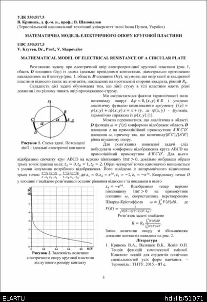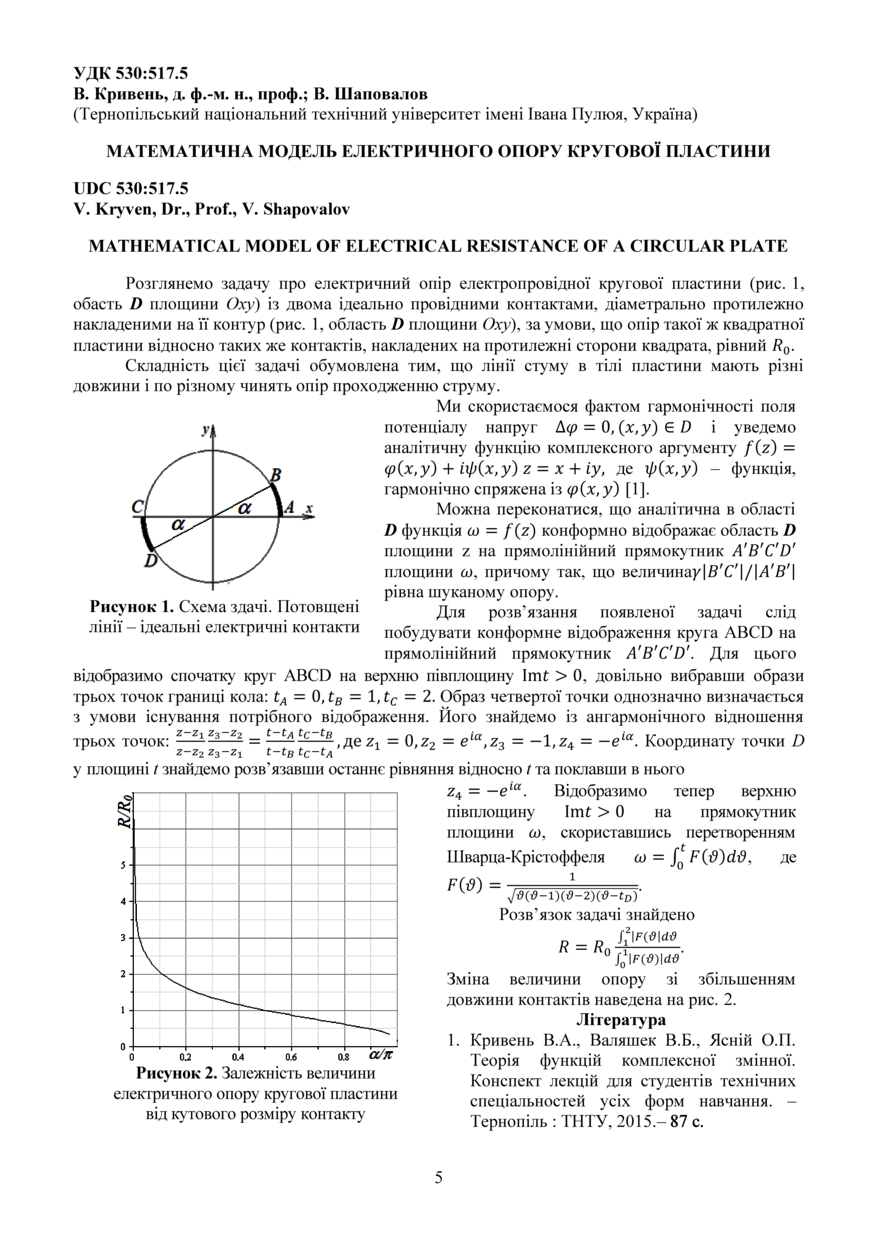 | Bibliographic citation (APA): | Kryven, V., & Shapovalov, V. (2025). Matematychna model elektrychnoho oporu kruhovoi plastyny [Mathematical model of electrical resistance of a circular plate]. Materials of the ⅩⅢ Scientific and Technical Conference “Information Models, Systems, and Technologies”, 17-18 December 2025, Ternopil, 5. TNTU. [in Ukrainian]. |