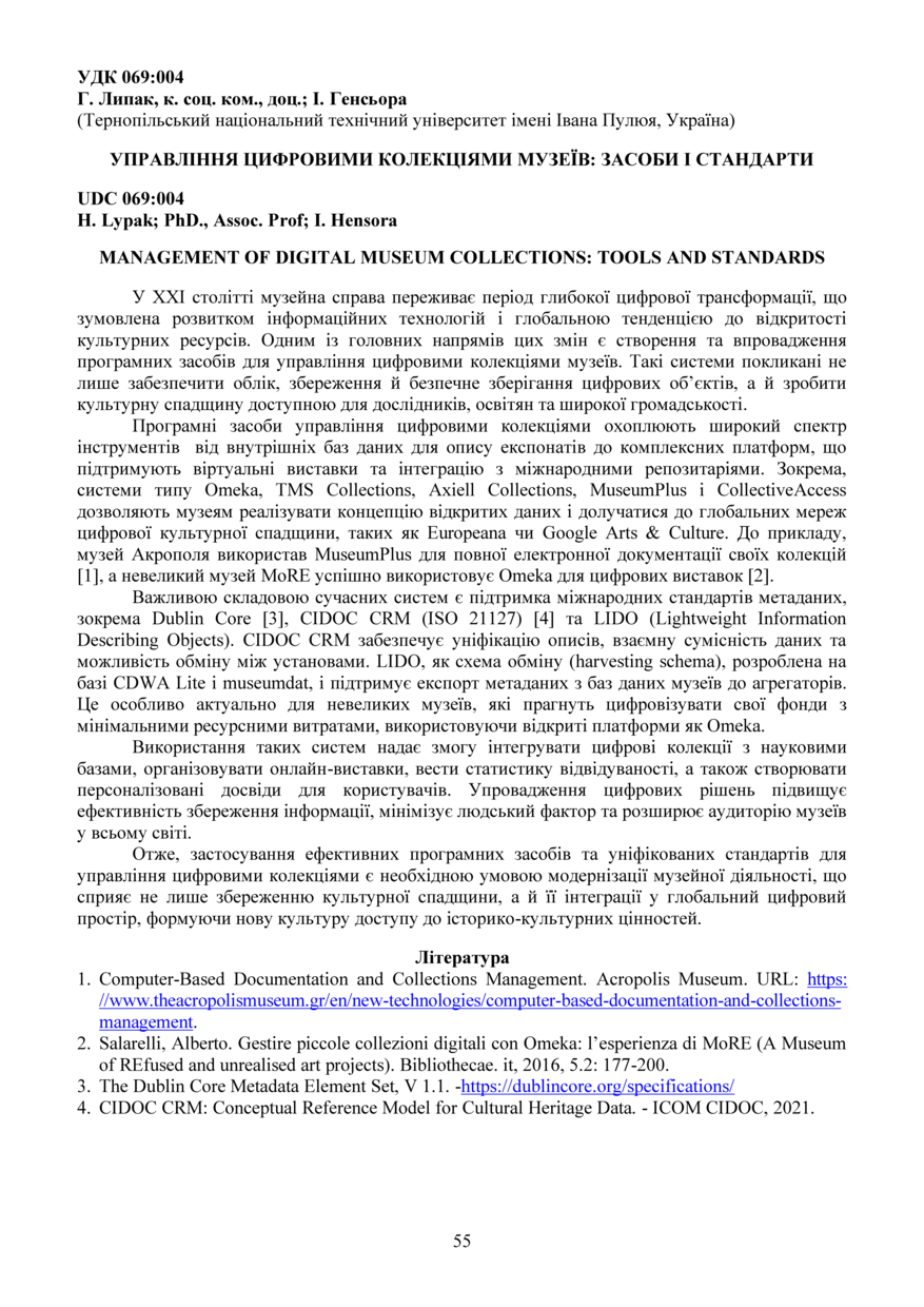 | Bibliographic citation (APA): | Lypak, H., & Hensora, I. (2025). Upravlinnia tsyfrovymy kolektsiiamy muzeiv: zasoby i standarty [Management of digital museum collections: tools and standards]. Materials of the ⅩⅢ Scientific and Technical Conference “Information Models, Systems, and Technologies”, 17-18 December 2025, Ternopil, 55. TNTU. [in Ukrainian]. |