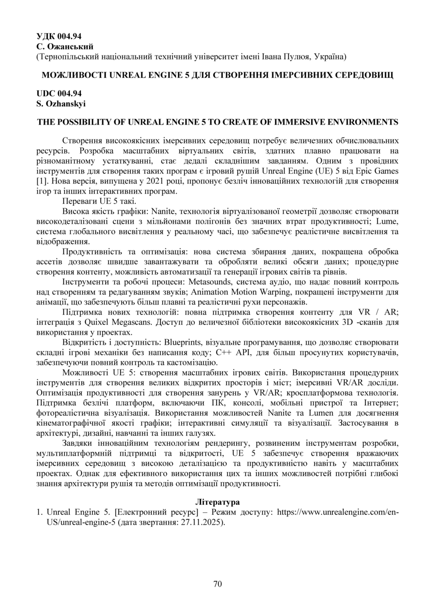 | Bibliographic citation (APA): | Ozhanskyi, S. (2025). Mozhlyvosti unreal engine 5 dlia stvorennia imersyvnykh seredovyshch [The possibility of unreal engine 5 to create of immersive environments]. Materials of the ⅩⅢ Scientific and Technical Conference “Information Models, Systems, and Technologies”, 17-18 December 2025, Ternopil, 70. TNTU. [in Ukrainian]. |