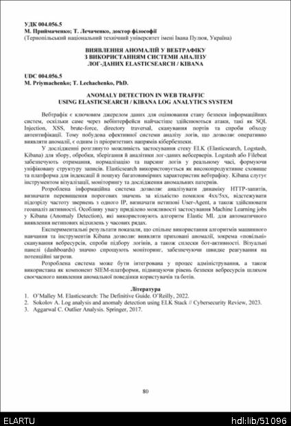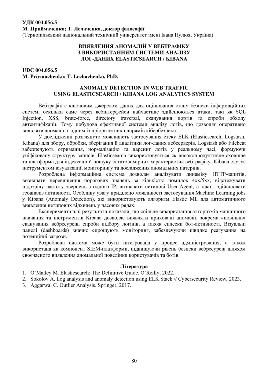Bibliographic reference (2015): Приймаченко М., Лечаченко Т. Виявлення аномалій у вебтрафіку з використанням системи аналізу лог-даних elasticsearch / kibana // Матеріали ⅩⅢ науково-технічної конференції „Інформаційні моделі, системи та технології“, Тернопіль, 17-18 грудня 2025 року. 2025. С. 80.