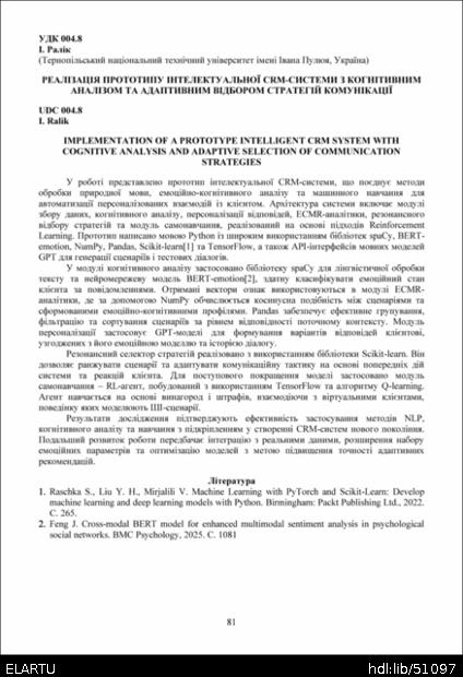 | Bibliographic citation (APA): | Ralik, I. (2025). Realizatsiia prototypu intelektualnoi crm-systemy z kohnityvnym analizom ta adaptyvnym vidborom stratehii komunikatsii [Implementation of a prototype intelligent crm system with cognitive analysis and adaptive selection of communication strategies]. Materials of the ⅩⅢ Scientific and Technical Conference “Information Models, Systems, and Technologies”, 17-18 December 2025, Ternopil, 81. TNTU. [in Ukrainian]. |