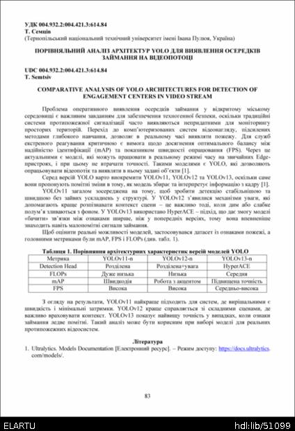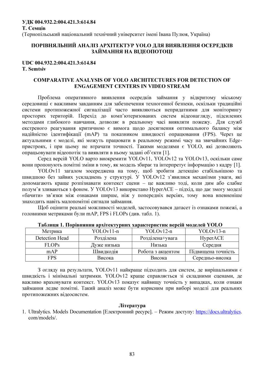 Bibliographic description (Ukraine): Семців Т. Порівняльний аналіз архітектур yolo для виявлення осередків займання на відеопотоці / Т. Семців // Матеріали ⅩⅢ науково-технічної конференції „Інформаційні моделі, системи та технології“, 17-18 грудня 2025 року. — Т. : ТНТУ, 2025. — С. 83. — (Математичне моделювання).