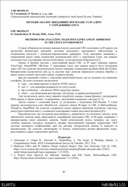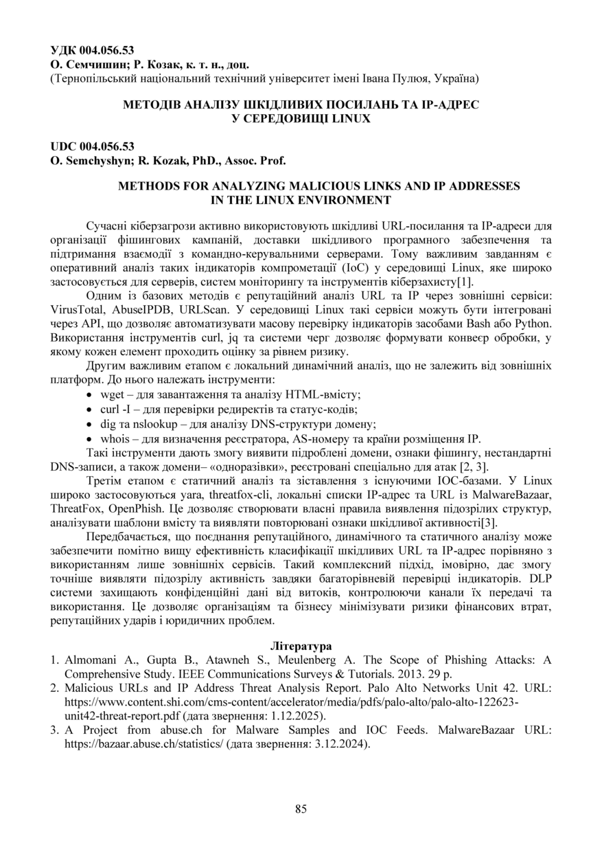 Bibliographic citation (APA): Semchyshyn, O., & Kozak, R. (2025). Metodiv analizu shkidlyvykh posylan ta ip-adres u seredovyshchi linux [Methods for analyzing malicious links and ip addresses in the linux environment]. Materials of the ⅩⅢ Scientific and Technical Conference “Information Models, Systems, and Technologies”, 17-18 December 2025, Ternopil, 85. TNTU. [in Ukrainian].
