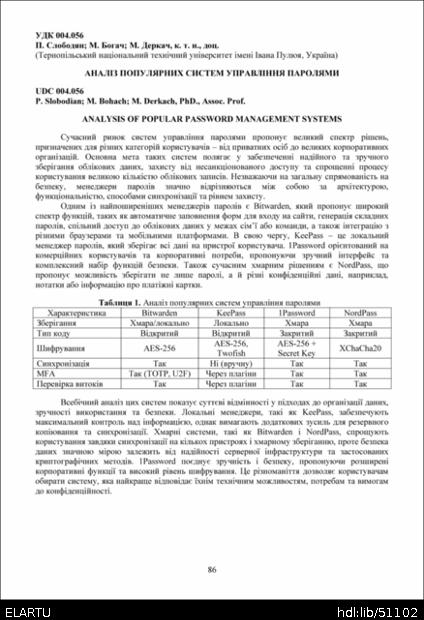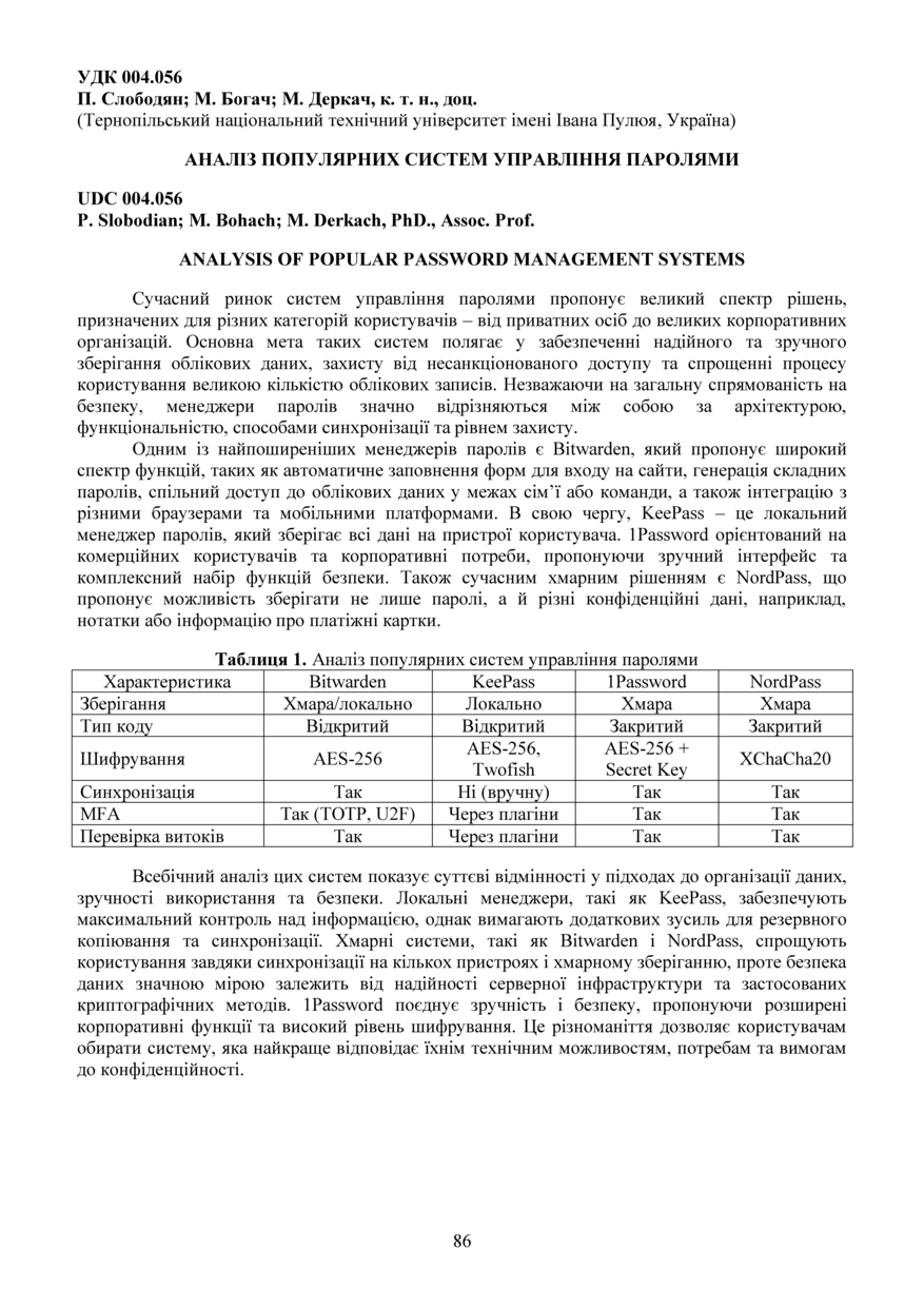 | Bibliographic citation (APA): | Slobodian, P., Bohach, M., & Derkach, M. (2025). Analiz populiarnykh system upravlinnia paroliamy [Analysis of popular password management systems]. Materials of the ⅩⅢ Scientific and Technical Conference “Information Models, Systems, and Technologies”, 17-18 December 2025, Ternopil, 86. TNTU. [in Ukrainian]. |