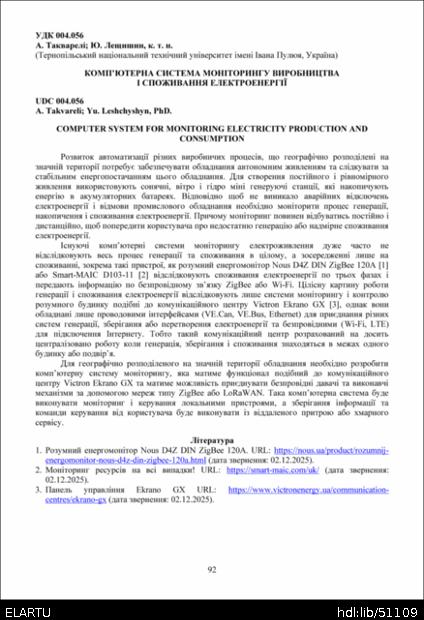 | References (Ukraine): | 1. Розумний енергомонітор Nous D4Z DIN ZigBee 120A. URL: https://nous.ua/product/rozumnij-energomonitor-nous-d4z-din-zigbee-120a.html (дата звернення: 02.12.2025). 2. Моніторинг ресурсів на всі випадки! URL: https://smart-maic.com/uk/ (дата звернення: 02.12.2025). 3. Панель управління Ekrano GX URL: https://www.victronenergy.ua/communication-centres/ekrano-gx (дата звернення: 02.12.2025). |