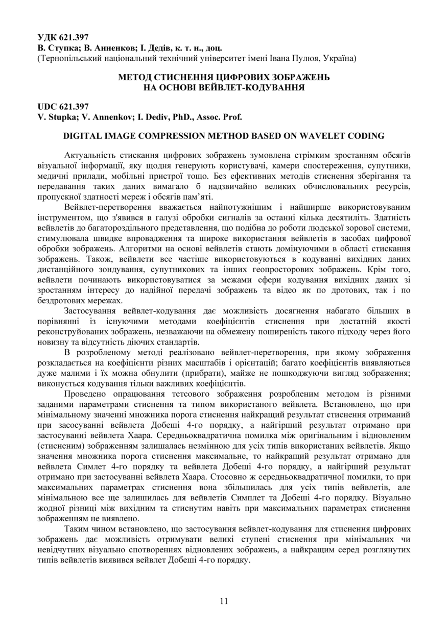 | Bibliographic citation (APA): | Stupka, V., Annenkov, V., & Dediv, I. (2025). Metod stysnennia tsyfrovykh zobrazhen na osnovi veivlet-koduvannia [Digital image compression method based on wavelet coding]. Materials of the ⅩⅢ Scientific and Technical Conference “Information Models, Systems, and Technologies”, 17-18 December 2025, Ternopil, 11. TNTU. [in Ukrainian]. |
