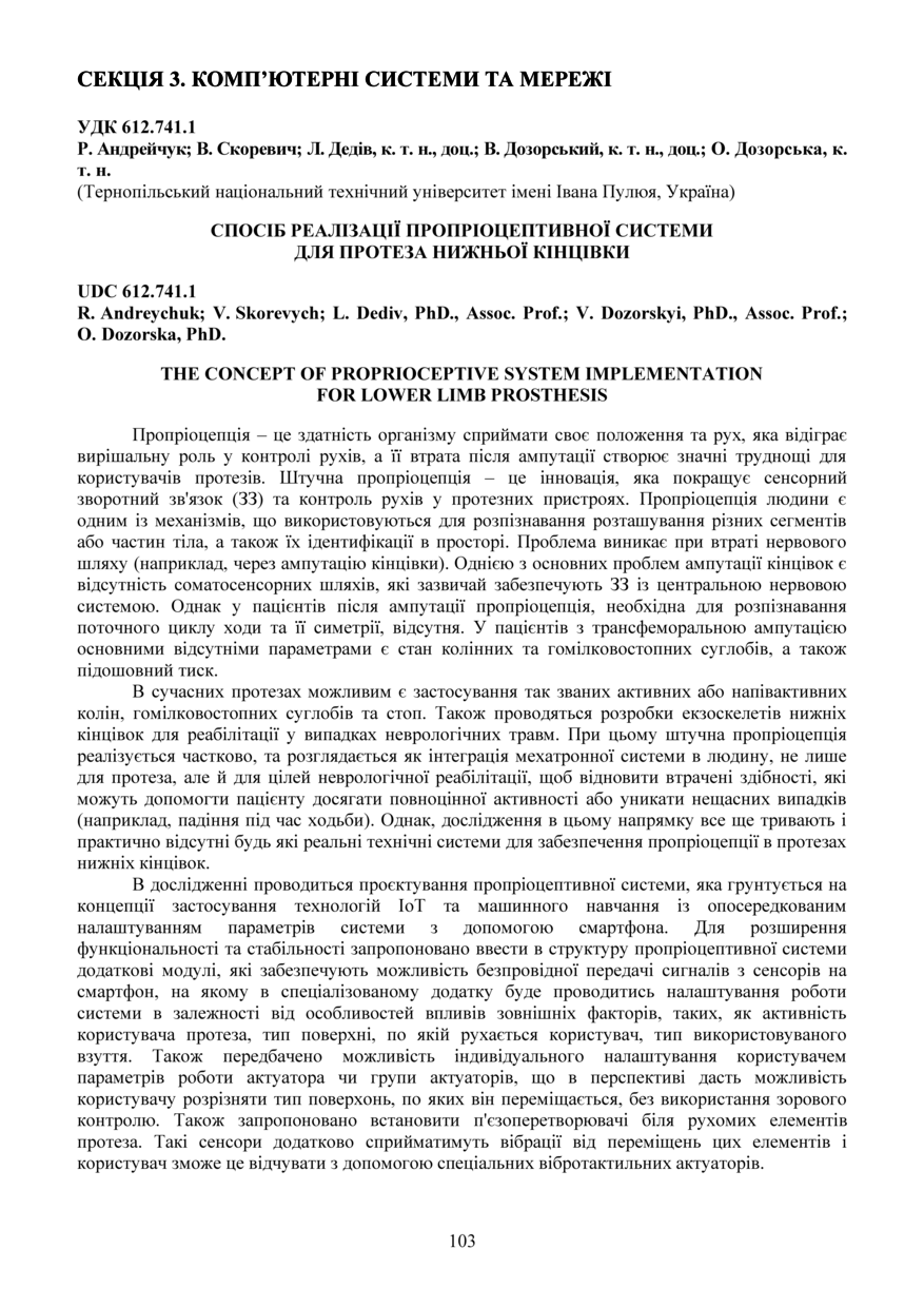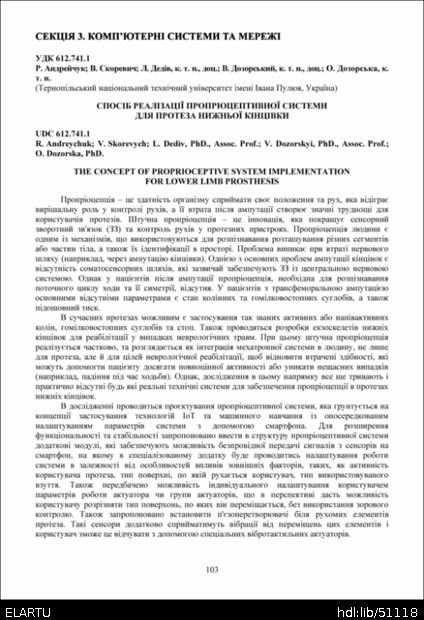 | Bibliographic citation (APA): | Andreychuk, R., Skorevych, V., Dediv, L., Dozorskyi, V., & Dozorska, O. (2025). Sposib realizatsii propriotseptyvnoi systemy dlia proteza nyzhnoi kintsivky [The concept of proprioceptive system implementation for lower limb prosthesis]. Materials of the ⅩⅢ Scientific and Technical Conference “Information Models, Systems, and Technologies”, 17-18 December 2025, Ternopil, 103. TNTU. [in Ukrainian]. |