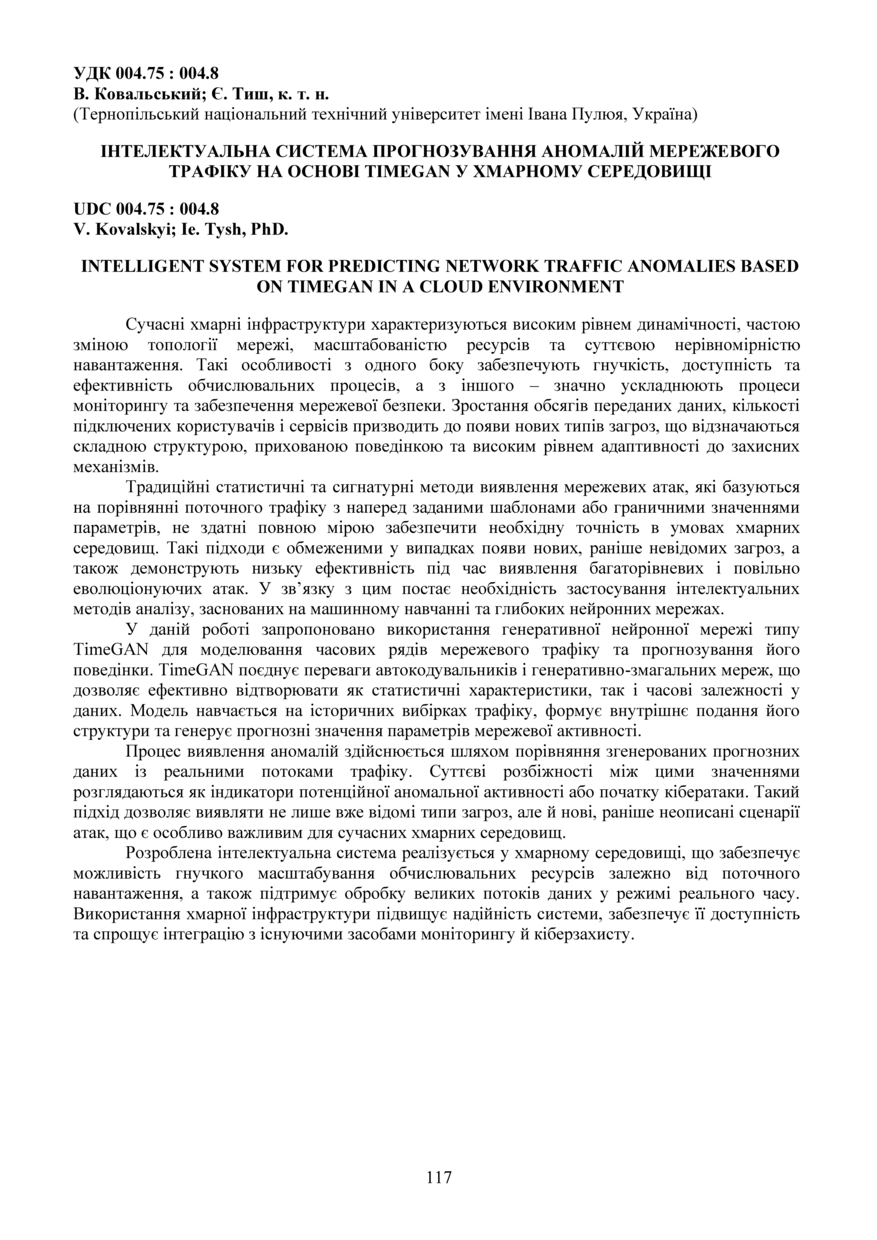 | Bibliographic citation (APA): | Kovalskyi, V., & Tysh, Ie. (2025). Intelektualna systema prohnozuvannia anomalii merezhevoho trafiku na osnovi timegan u khmarnomu seredovyshchi [Intelligent system for predicting network traffic anomalies based on timegan in a cloud environment]. Materials of the ⅩⅢ Scientific and Technical Conference “Information Models, Systems, and Technologies”, 17-18 December 2025, Ternopil, 117. TNTU. [in Ukrainian]. |