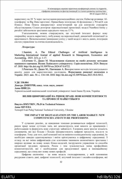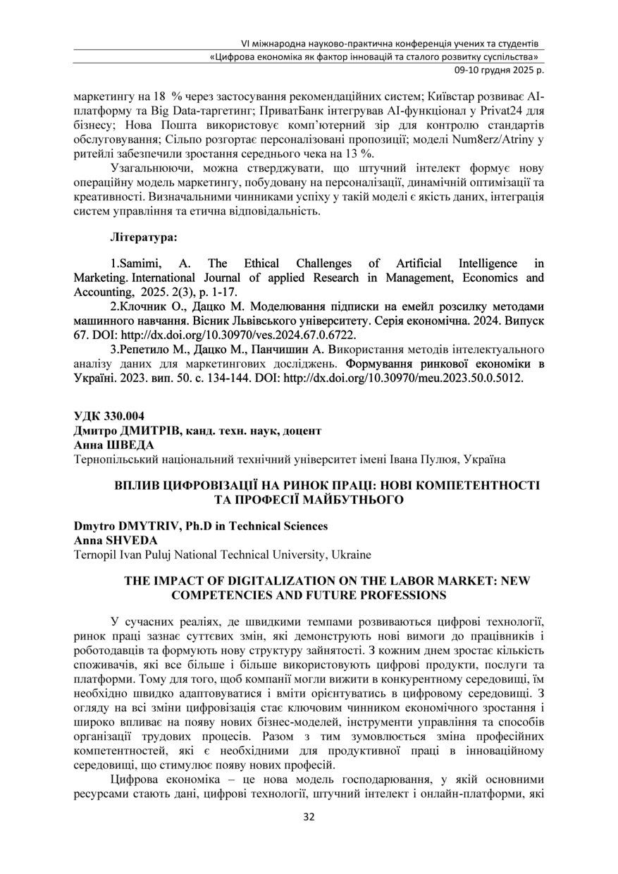 Bibliographic citation (CHICAGO): Dmytriv D., Shveda A. (2025) Vplyv tsyfrovizatsii na rynok pratsi: novi kompetentnosti ta profesii maibutnoho [The impact of digitalization on the labor market: new competencies and future professions]. Proceedings of the 6th International Scientific and Practical Conference „Digital economy as a factor of innovative and sustainable development of society“ (Tern., 9-10 December 2025), pp. 32-34 [in Ukrainian].