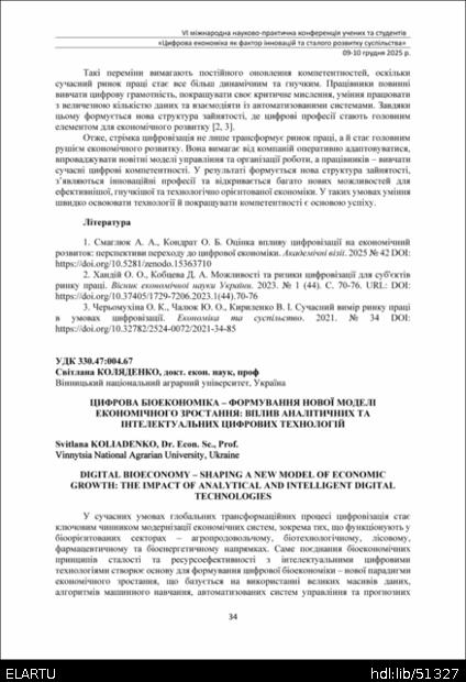 | Bibliographic citation (APA): | Koliadenko, S. (2025). Tsyfrova bioekonomika – formuvannia novoi modeli ekonomichnoho zrostannia: vplyv analitychnykh ta intelektualnykh tsyfrovykh tekhnolohii [Digital bioeconomy – shaping a new model of economic growth: the impact of analytical and intelligent digital technologies]. Proceedings of the 6th International Scientific and Practical Conference „Digital economy as a factor of innovative and sustainable development of society“, 9-10 December 2025, Ternopil, 34-37. TNTU. [in Ukrainian]. |