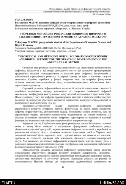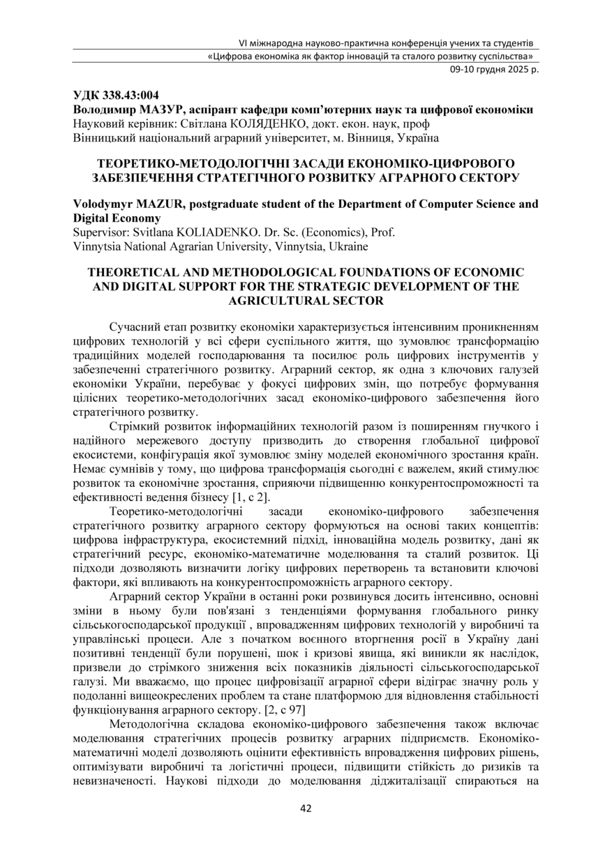 | Bibliographic citation (APA): | Mazur, V. (2025). Teoretyko-metodolohichni zasady ekonomiko-tsyfrovoho zabezpechennia stratehichnoho rozvytku ahrarnoho sektoru [Theoretical and methodological foundations of economic and digital support for the strategic development of the agricultural sector]. Proceedings of the 6th International Scientific and Practical Conference „Digital economy as a factor of innovative and sustainable development of society“, 9-10 December 2025, Ternopil, 42-43. TNTU. [in Ukrainian]. |