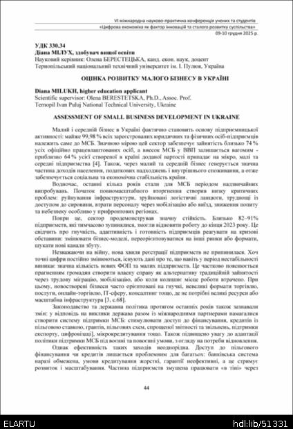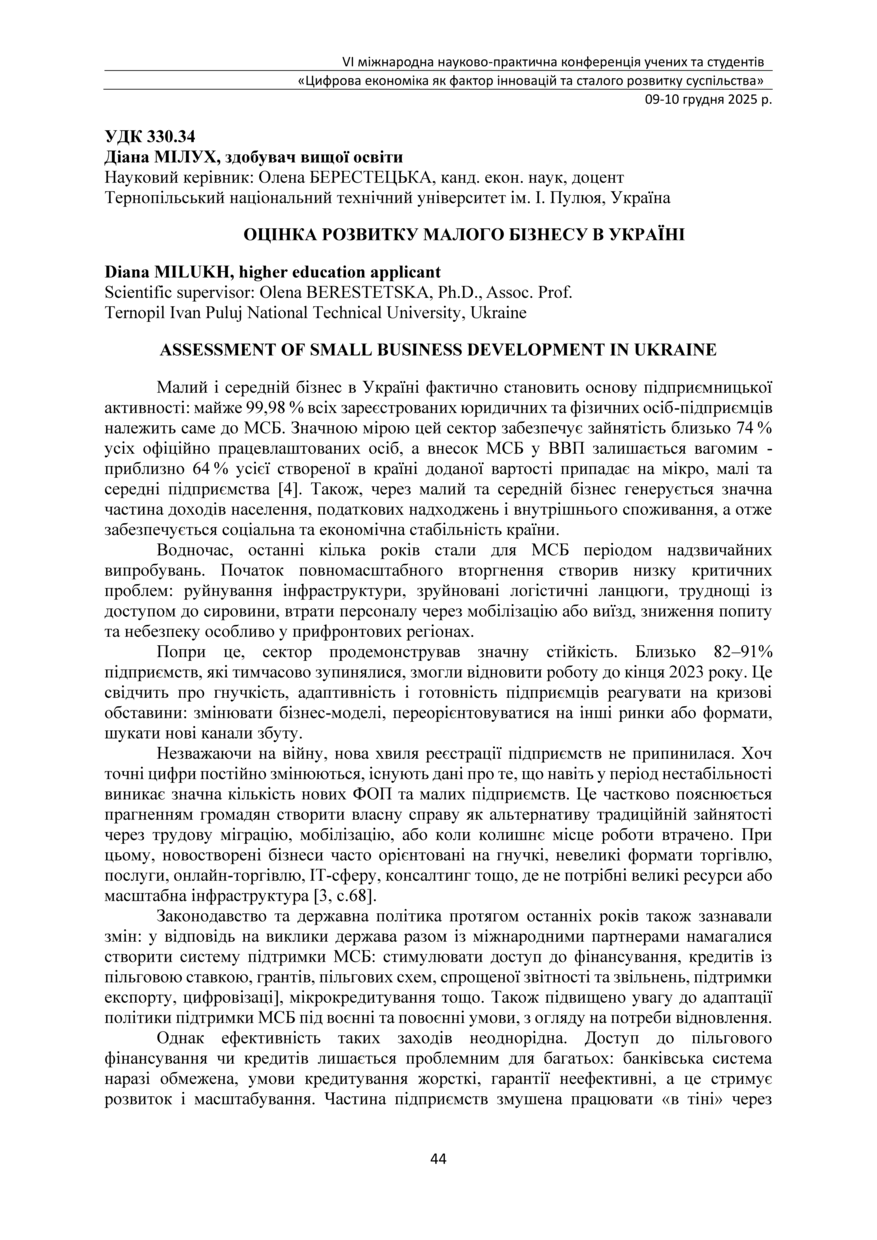 | Bibliographic citation (APA): | Milukh, D. (2025). Otsinka rozvytku maloho biznesu v Ukraini [Assessment of small business development in Ukraine]. Proceedings of the 6th International Scientific and Practical Conference „Digital economy as a factor of innovative and sustainable development of society“, 9-10 December 2025, Ternopil, 44-46. TNTU. [in Ukrainian]. |