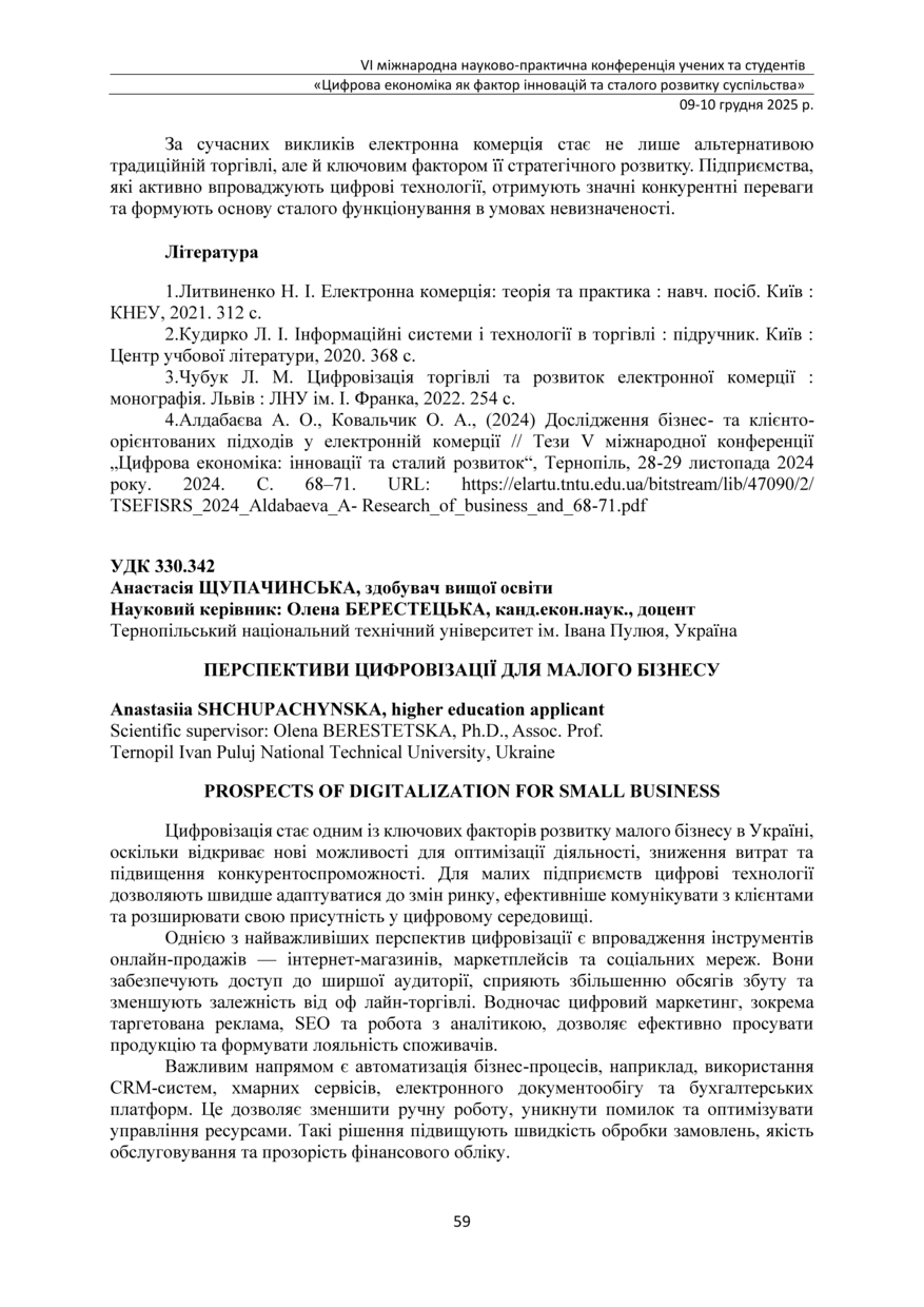 Bibliographic citation (APA): Shchupachynska, A. (2025). Perspektyvy tsyfrovizatsii dlia maloho biznesu [Prospects of digitalization for small business]. Proceedings of the 6th International Scientific and Practical Conference „Digital economy as a factor of innovative and sustainable development of society“, 9-10 December 2025, Ternopil, 59-60. TNTU. [in Ukrainian].