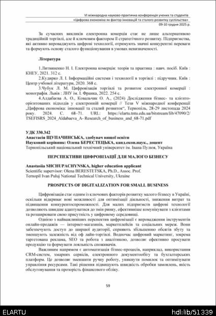 Bibliographic citation (CHICAGO): Shchupachynska A. (2025) Perspektyvy tsyfrovizatsii dlia maloho biznesu [Prospects of digitalization for small business]. Proceedings of the 6th International Scientific and Practical Conference „Digital economy as a factor of innovative and sustainable development of society“ (Tern., 9-10 December 2025), pp. 59-60 [in Ukrainian].