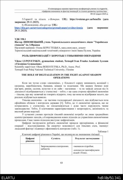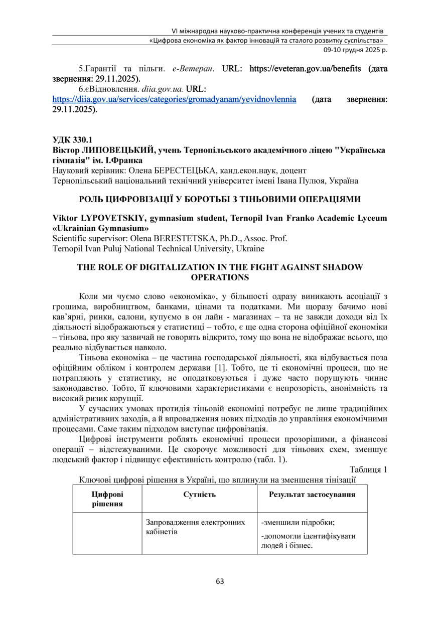 | Bibliographic citation (APA): | Lypovetskiy, V. (2025). Rol tsyfrovizatsii u borotbi z tinovymy operatsiiamy [The role of digitalization in the fight against shadow operations]. Proceedings of the 6th International Scientific and Practical Conference „Digital economy as a factor of innovative and sustainable development of society“, 9-10 December 2025, Ternopil, 63-64. TNTU. [in Ukrainian]. |