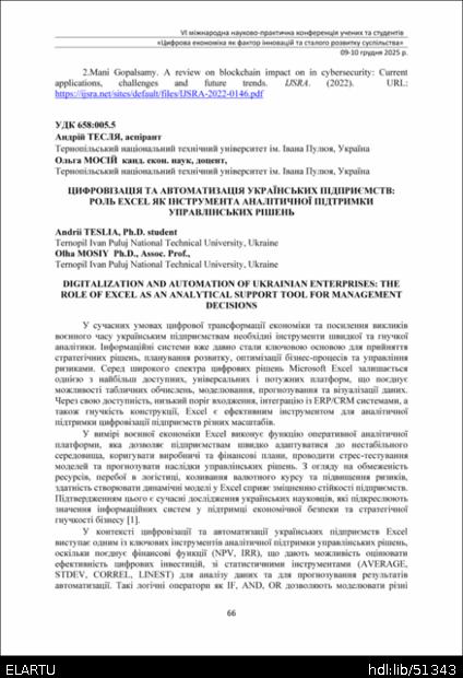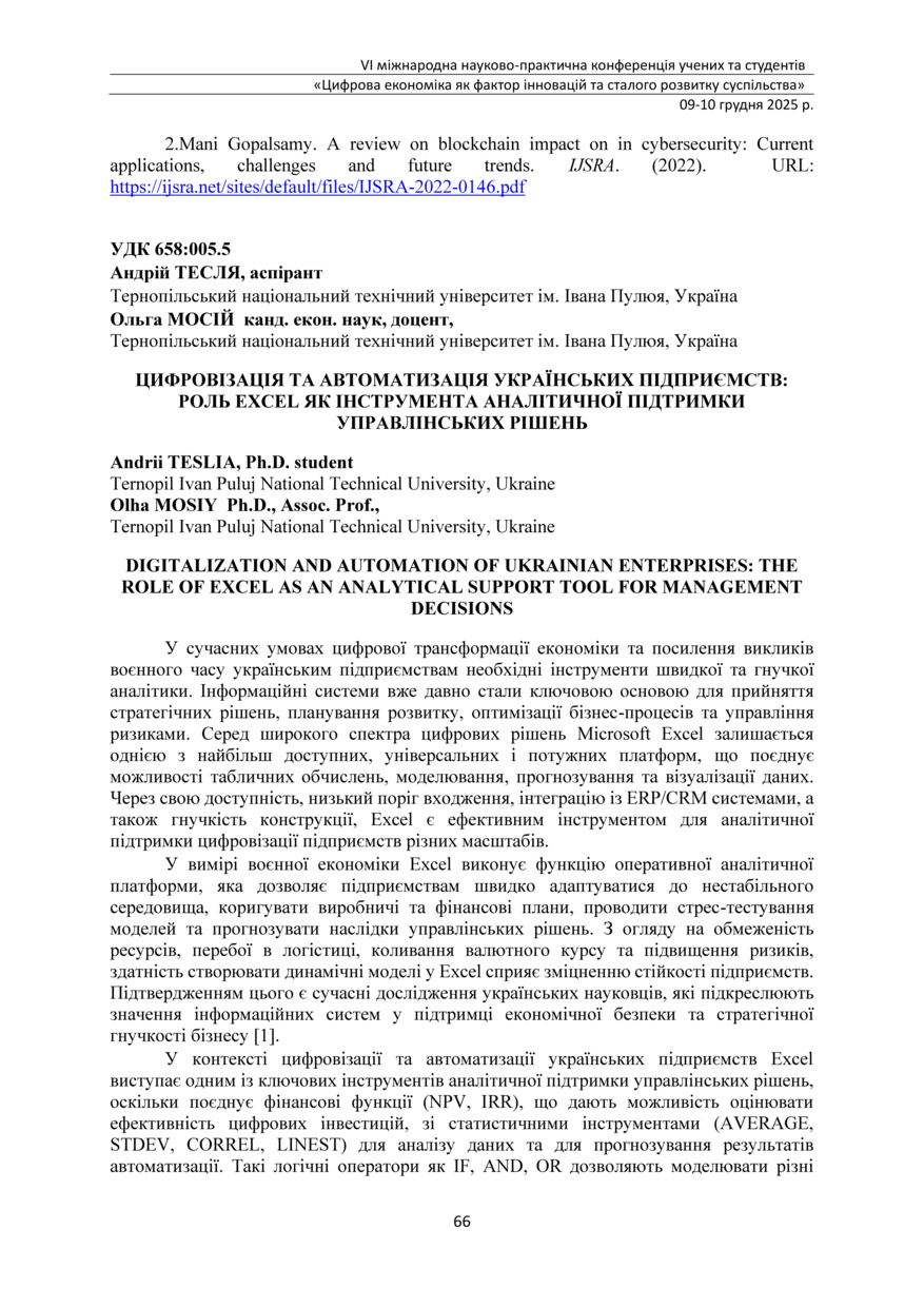 | Bibliographic citation (APA): | Teslia, A., & Mosiy, O. (2025). Tsyfrovizatsiia ta avtomatyzatsiia ukrainskykh pidpryiemstv: rol Excel yak instrumenta analitychnoi pidtrymky upravlinskykh rishen [Digitalization and automation of ukrainian enterprises: the role of Excel as an analytical support tool for management decisions]. Proceedings of the 6th International Scientific and Practical Conference „Digital economy as a factor of innovative and sustainable development of society“, 9-10 December 2025, Ternopil, 66-68. TNTU. [in Ukrainian]. |