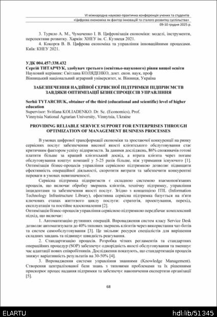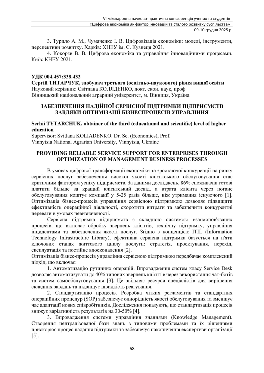 | Bibliographic citation (APA): | Tytarchuk, S. (2025). Zabezpechennia nadiinoi servisnoi pidtrymky pidpryiemstv zavdiaky optymizatsii biznesprotsesiv upravlinnia [Providing reliable service support for enterprises through optimization of management business processes]. Proceedings of the 6th International Scientific and Practical Conference „Digital economy as a factor of innovative and sustainable development of society“, 9-10 December 2025, Ternopil, 68-70. TNTU. [in Ukrainian]. |