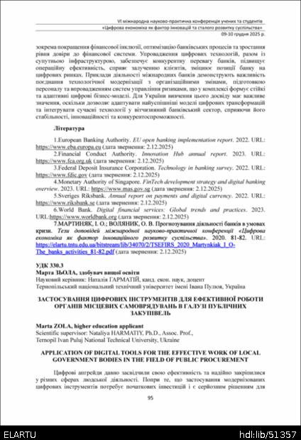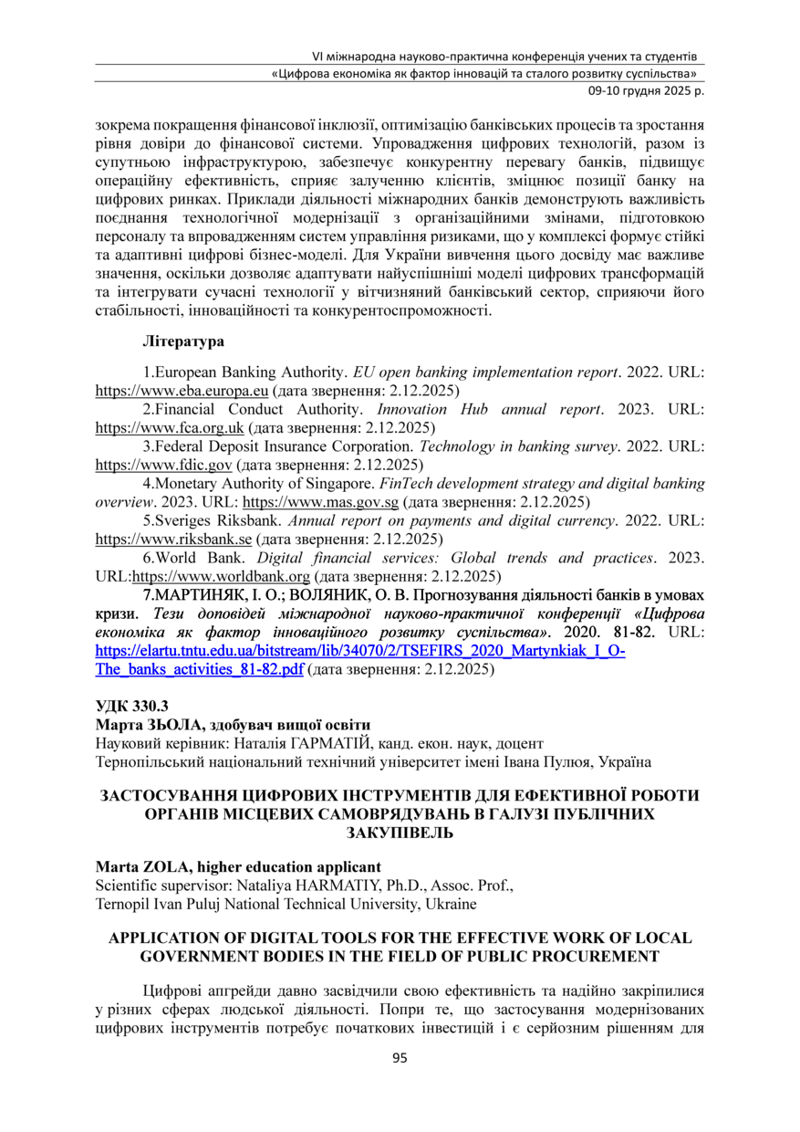 | Bibliographic citation (APA): | Zola, M. (2025). Zastosuvannia tsyfrovykh instrumentiv dlia efektyvnoi roboty orhaniv mistsevykh samovriaduvan v haluzi publichnykh zakupivel [Application of digital tools for the effective work of local government bodies in the field of public procurement]. Proceedings of the 6th International Scientific and Practical Conference „Digital economy as a factor of innovative and sustainable development of society“, 9-10 December 2025, Ternopil, 95-97. TNTU. [in Ukrainian]. |