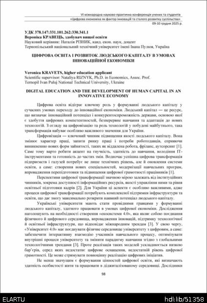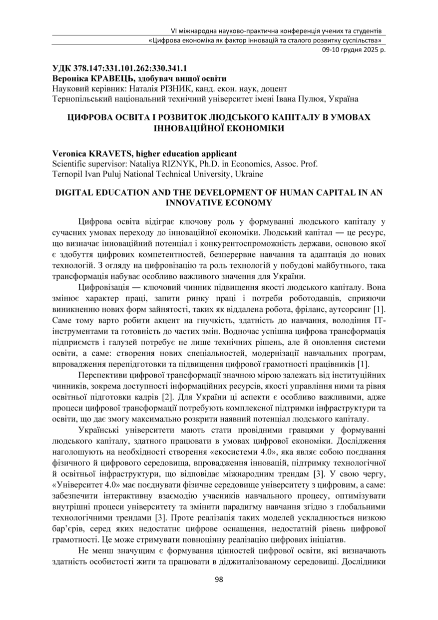 | Bibliographic citation (APA): | Kravets, V. (2025). Tsyfrova osvita i rozvytok liudskoho kapitalu v umovakh innovatsiinoi ekonomiky [Digital education and the development of human capital in an innovative economy]. Proceedings of the 6th International Scientific and Practical Conference „Digital economy as a factor of innovative and sustainable development of society“, 9-10 December 2025, Ternopil, 98-99. TNTU. [in Ukrainian]. |