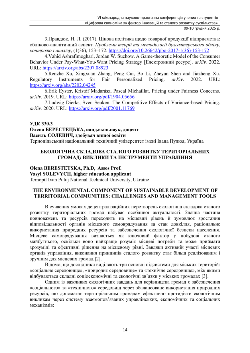 Bibliographic citation (APA): Berestetska, O., & Solevych, V. (2025). Ekolohichna skladova staloho rozvytku terytorialnykh hromad: vyklyky ta instrumenty upravlinnia [The environmental component of sustainable development of territorial communities: challenges and management tools]. Proceedings of the 6th International Scientific and Practical Conference „Digital economy as a factor of innovative and sustainable development of society“, 9-10 December 2025, Ternopil, 14-16. TNTU. [in Ukrainian].