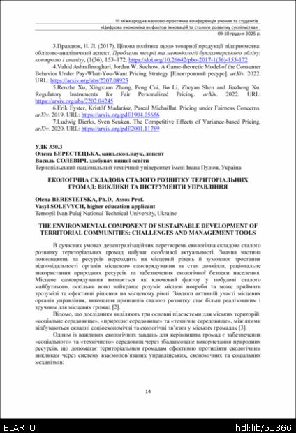 Bibliographic reference (2015): Берестецька О., Солевич В. Екологічна складова сталого розвитку територіальних громад: виклики та інструменти управління // Тези Ⅵ міжнар. наук.-практ. конф. „Цифрова економіка як фактор інновацій та сталого розвитку суспільства“, Тернопіль, 9–10 грудня 2025 року. 2025. С. 14–16.