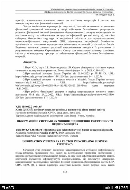 | Bibliographic citation (APA): | Dykyi, Y. (2025). Informatsiini systemy yak chynnyk pidvyshchennia efektyvnosti pidpryiemnytstva [Information systems as a factor in increasing business efficiency]. Proceedings of the 6th International Scientific and Practical Conference „Digital economy as a factor of innovative and sustainable development of society“, 9-10 December 2025, Ternopil, 119-122. TNTU. [in Ukrainian]. |