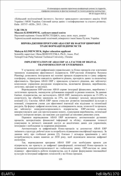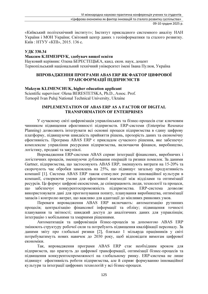 | Bibliographic citation (APA): | Klimenchuk, M. (2025). Vprovadzhennia prohramy ABAS ERP yak faktor tsyfrovoi transformatsii pidpryiemstv [Implementation oF ABAS ERP as a factor of digital transformation of enterprises]. Proceedings of the 6th International Scientific and Practical Conference „Digital economy as a factor of innovative and sustainable development of society“, 9-10 December 2025, Ternopil, 125-126. TNTU. [in Ukrainian]. |