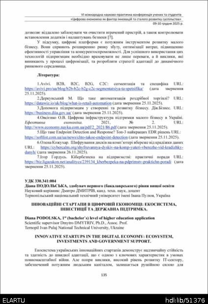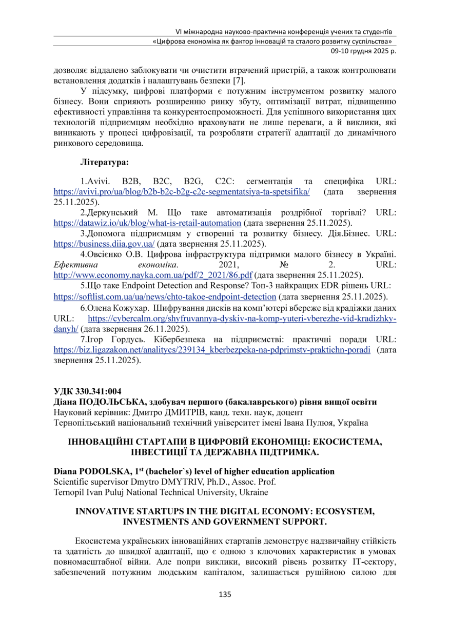 | Bibliographic citation (APA): | Podolska, D. (2025). Innovatsiini startapy v tsyfrovii ekonomitsi: ekosystema, investytsii ta derzhavna pidtrymka [Innovative startups in the digital economy: ecosystem, investments and government support]. Proceedings of the 6th International Scientific and Practical Conference „Digital economy as a factor of innovative and sustainable development of society“, 9-10 December 2025, Ternopil, 135-137. TNTU. [in Ukrainian]. |