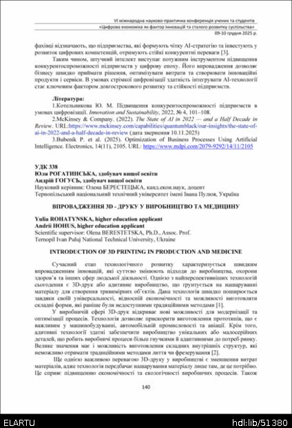 | Bibliographic citation (CHICAGO): | Rohatynska Y., Hohus A. (2025) Vprovadzhennia 3D-druku u virobnitstvo ta meditsinu [Introduction of 3D-printing in production and medicine]. Proceedings of the 6th International Scientific and Practical Conference „Digital economy as a factor of innovative and sustainable development of society“ (Tern., 9-10 December 2025), pp. 140-142 [in Ukrainian]. |