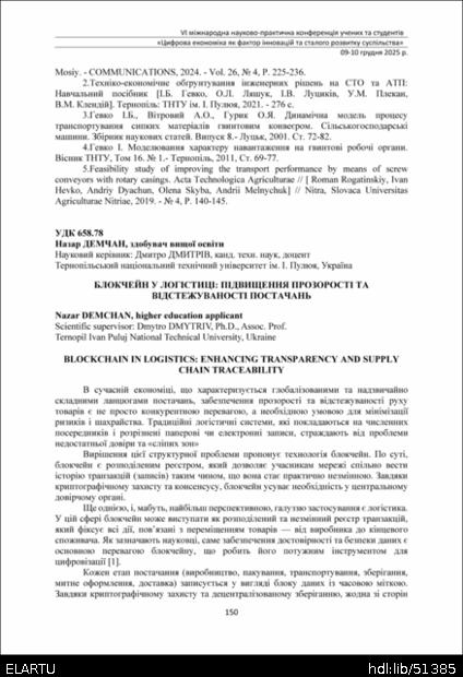 | Bibliographic citation (APA): | Demchan, N. (2025). Blokchein u lohistytsi: pidvyshchennia prozorosti ta vidstezhuvanosti postachan [Blockchain in logistics: enhancing transparency and supply chain traceability]. Proceedings of the 6th International Scientific and Practical Conference „Digital economy as a factor of innovative and sustainable development of society“, 9-10 December 2025, Ternopil, 150-151. TNTU. [in Ukrainian]. |