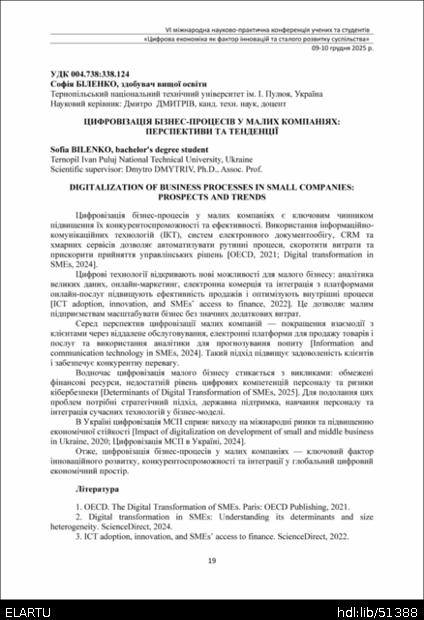 | Bibliographic citation (APA): | Bilenko, S. (2025). Tsyfrovizatsiia biznes-protsesiv u malykh kompaniiakh: perspektyvy ta tendentsii [Digitalization of business processes in small companies: prospects and trends]. Proceedings of the 6th International Scientific and Practical Conference „Digital economy as a factor of innovative and sustainable development of society“, 9-10 December 2025, Ternopil, 19-20. TNTU. [in Ukrainian]. |