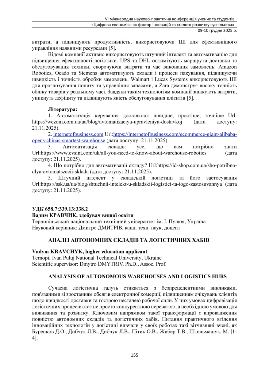 | Bibliographic citation (APA): | Kravchyk, V. (2025). Analiz avtonomnykh skladiv ta lohistychnykh khabiv [Analysis of autonomous warehouses and logistics hubs]. Proceedings of the 6th International Scientific and Practical Conference „Digital economy as a factor of innovative and sustainable development of society“, 9-10 December 2025, Ternopil, 155-157. TNTU. [in Ukrainian]. |