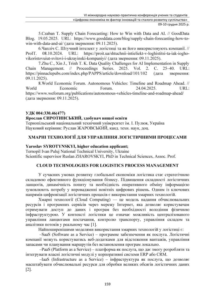 | Bibliographic citation (APA): | Syrotynskyi, Y. (2025). Khmarni tekhnolohii dlia upravlinnia lohistychnymy protsesamy [Cloud technologies for logistics process management]. Proceedings of the 6th International Scientific and Practical Conference „Digital economy as a factor of innovative and sustainable development of society“, 9-10 December 2025, Ternopil, 159-160. TNTU. [in Ukrainian]. |