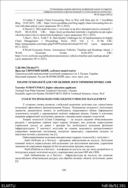 | Bibliographic citation (APA): | Syrotynskyi, Y. (2025). Khmarni tekhnolohii dlia upravlinnia lohistychnymy protsesamy [Cloud technologies for logistics process management]. Proceedings of the 6th International Scientific and Practical Conference „Digital economy as a factor of innovative and sustainable development of society“, 9-10 December 2025, Ternopil, 159-160. TNTU. [in Ukrainian]. |