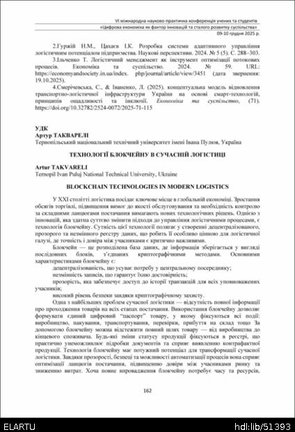| Bibliographic citation (APA): | Takvareli, A. (2025). Tekhnolohii blokcheinu v suchasnii lohistytsi [Blockchain technologies in modern logistics]. Proceedings of the 6th International Scientific and Practical Conference „Digital economy as a factor of innovative and sustainable development of society“, 9-10 December 2025, Ternopil, 162-163. TNTU. [in Ukrainian]. |