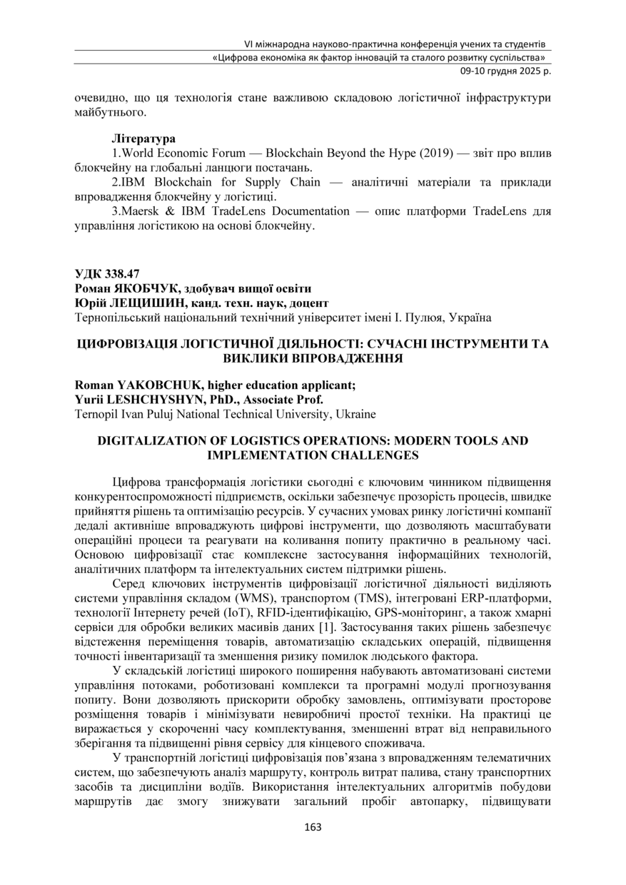 | Bibliographic citation (APA): | Yakobchuk, R., & Leshchyshyn, Y. (2025). Tsyfrovizatsiia lohistychnoi diialnosti: suchasni instrumenty ta vyklyky vprovadzhennia [Digitalization of logistics operations: modern tools and implementation challenges]. Proceedings of the 6th International Scientific and Practical Conference „Digital economy as a factor of innovative and sustainable development of society“, 9-10 December 2025, Ternopil, 163-164. TNTU. [in Ukrainian]. |