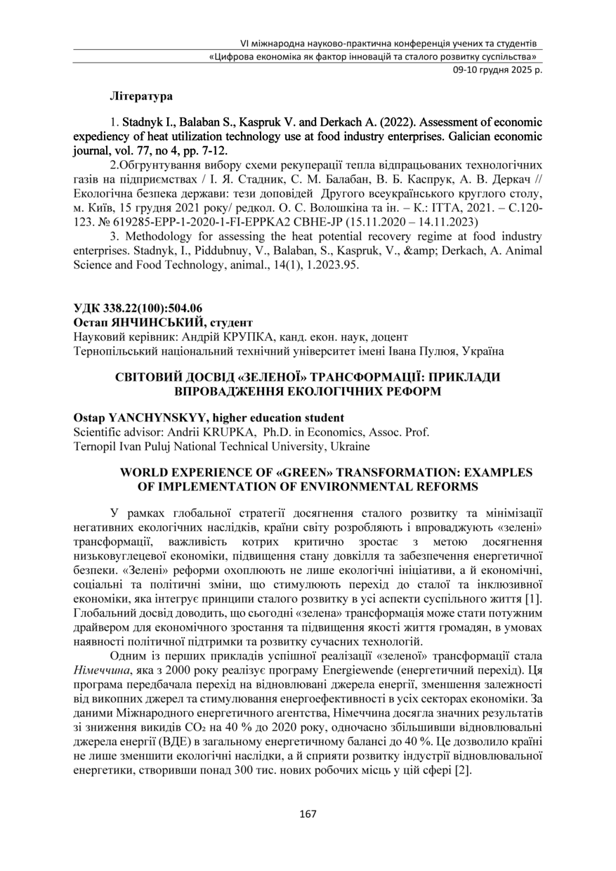 | Bibliographic citation (APA): | Yanchynskyy, O. (2025). Svitovyi dosvid "zelenoi" transformatsii: pryklady vprovadzhennia ekolohichnykh reform [World experience of «green» transformation: examples of implementation of environmental reforms]. Proceedings of the 6th International Scientific and Practical Conference „Digital economy as a factor of innovative and sustainable development of society“, 9-10 December 2025, Ternopil, 167-170. TNTU. [in Ukrainian]. |
